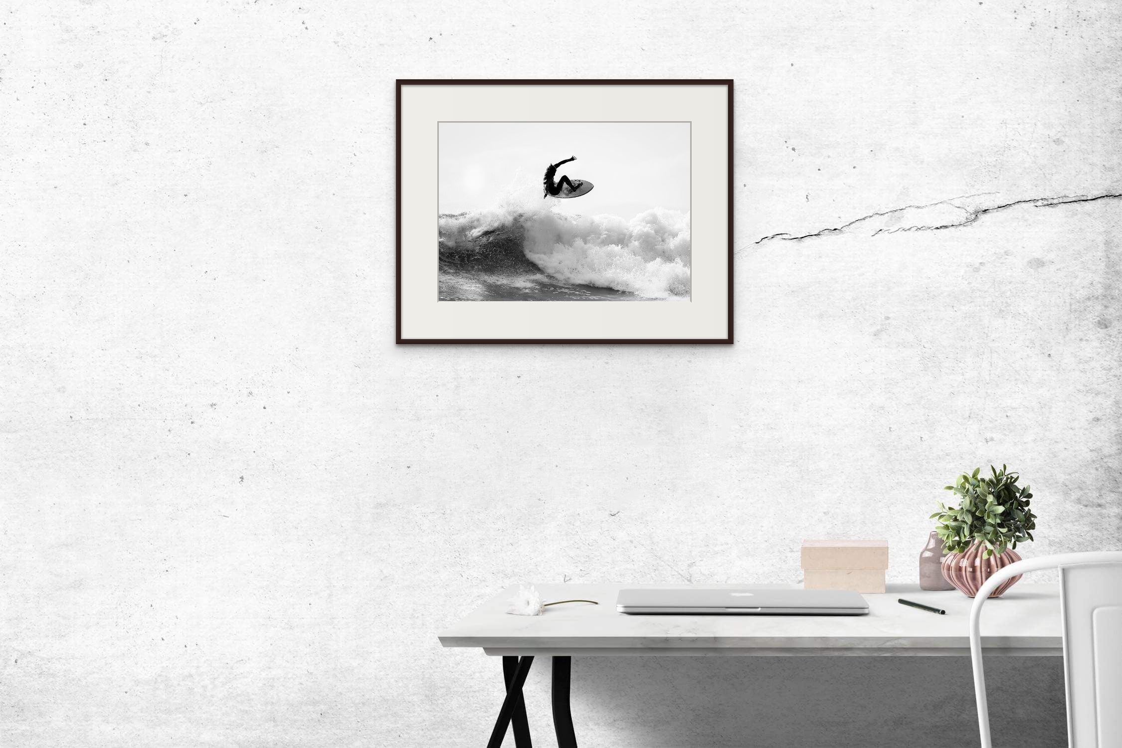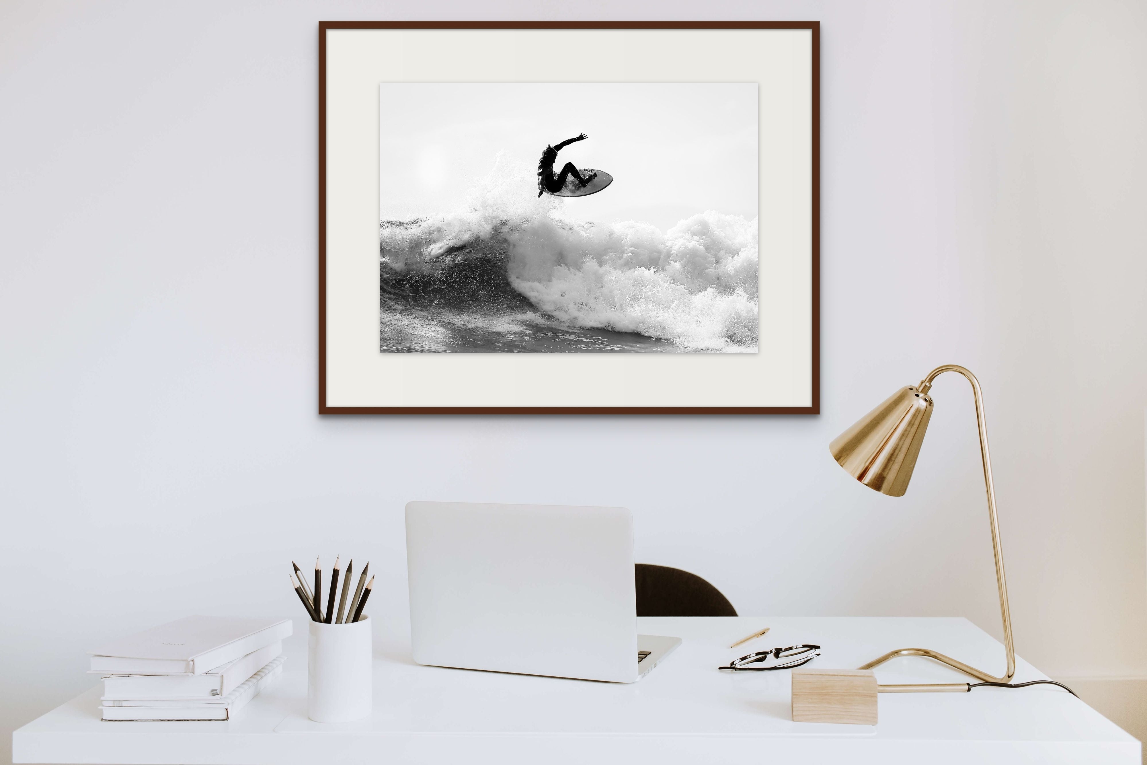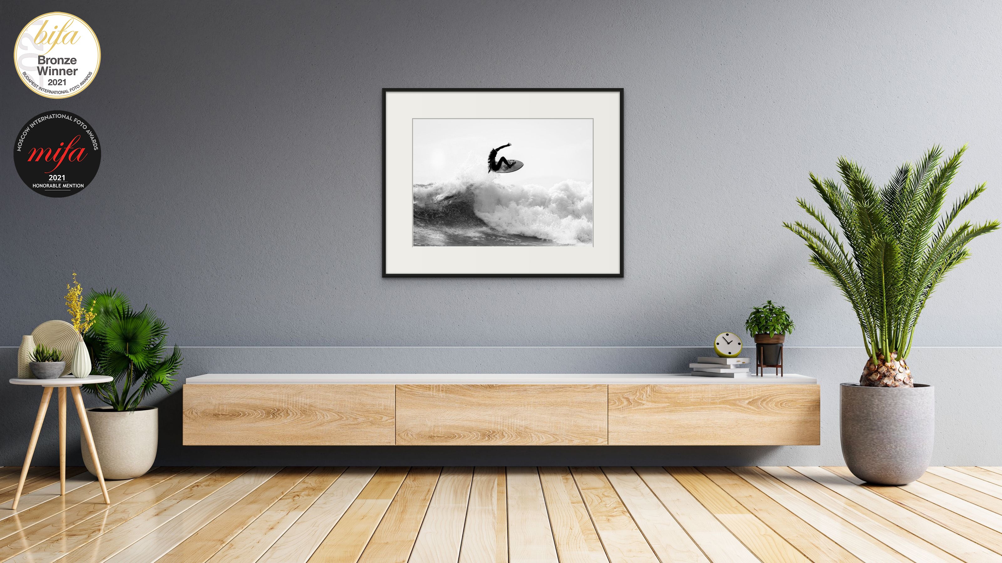 This internationally awarded black-and-white photograph captures a rare and electrifying moment: a surfer launching off the crest of a wave, suspended mid-air in a breathtaking display of freedom, power, and grace. A fleeting instant—frozen in time—where motion and stillness converge in perfect harmony with the pulse of the ocean.